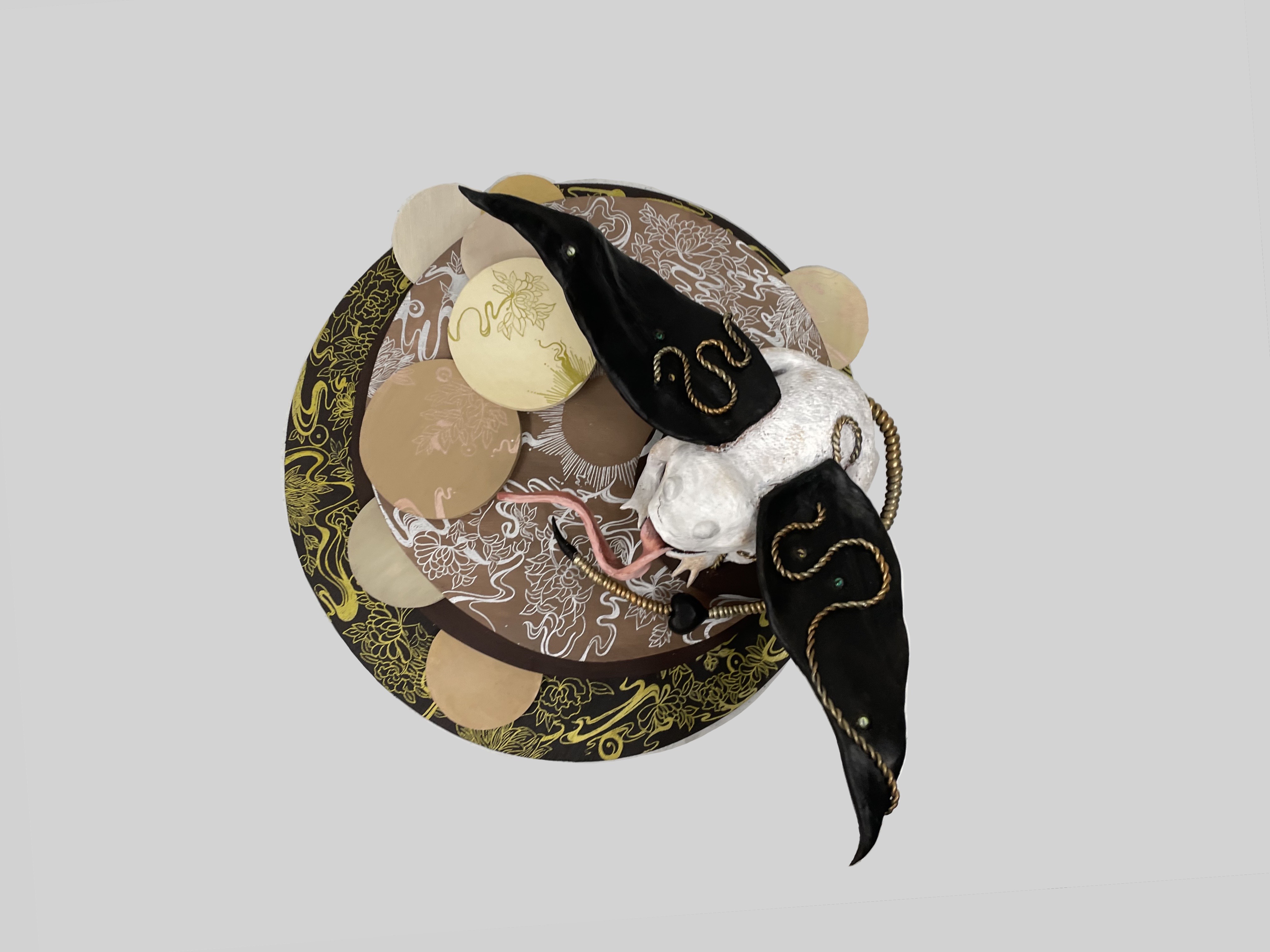 This sculpture presents the toad as a being between the earthly and the sacred. Perched on layered circular platforms with intricate motifs, its outstretched tongue and metallic details suggest transformation. Blending Buddhist symbolism with alchemical themes, the work turns the toad into a liminal figure, embodying change and transcendence.