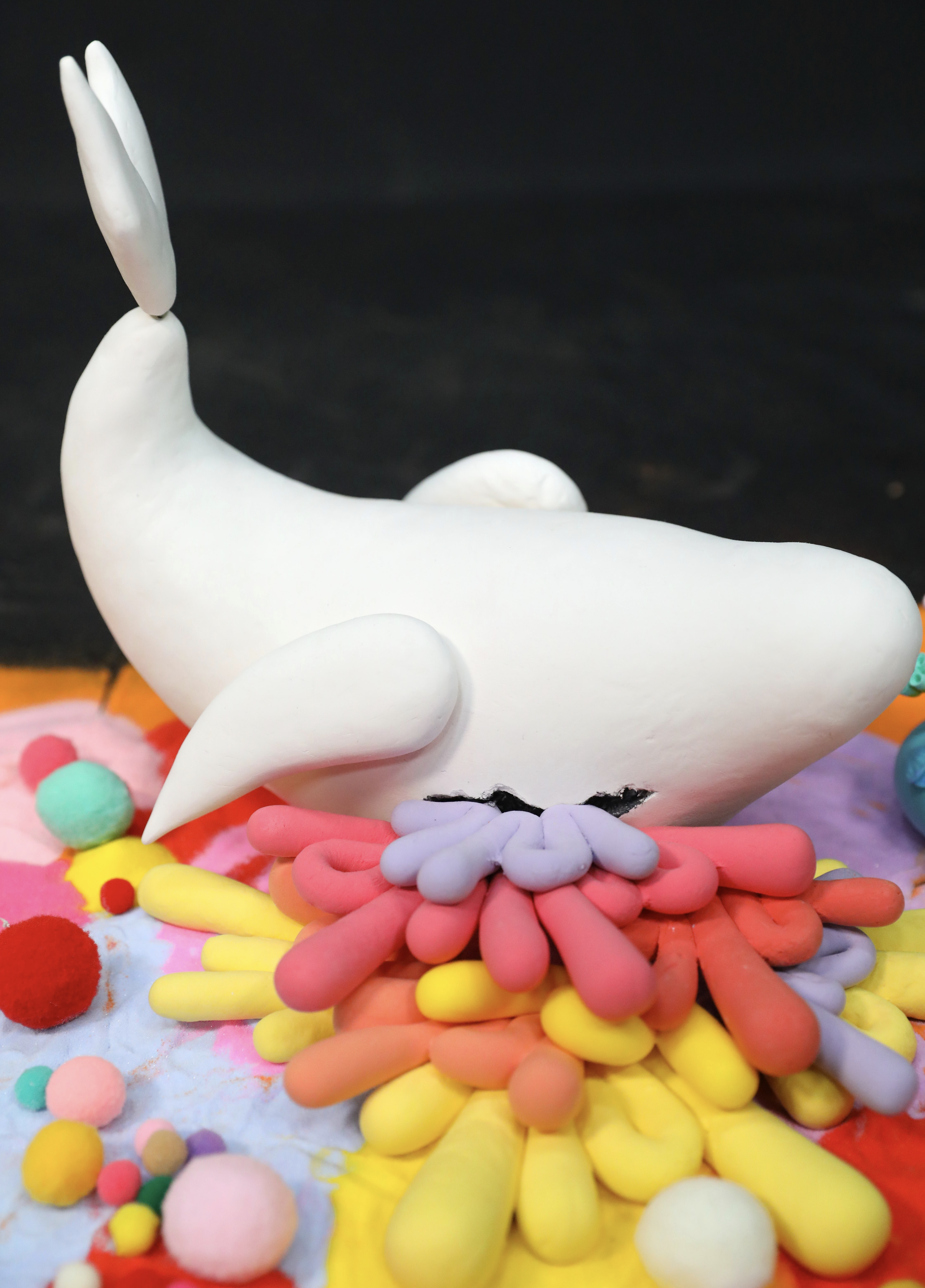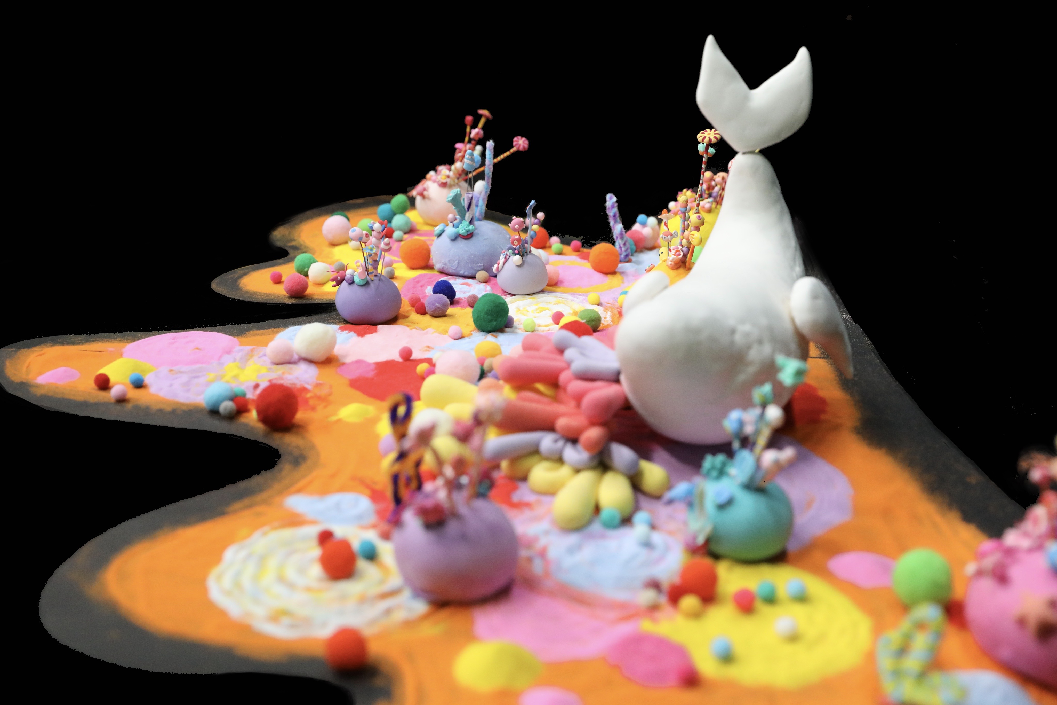 Inspired by the concept of whale fall, using dreamy and vibrant colors to depict the deep-sea ecological cycle. The whale’s remains become a source of nourishment, while the surrounding organic forms symbolize the proliferation of microorganisms and marine life. Soft materials and playful forms break away from the somber imagery of whale fall, presenting a wondrous interplay of death and renewal, inviting reflection on the delicate balance between decay and continuity.